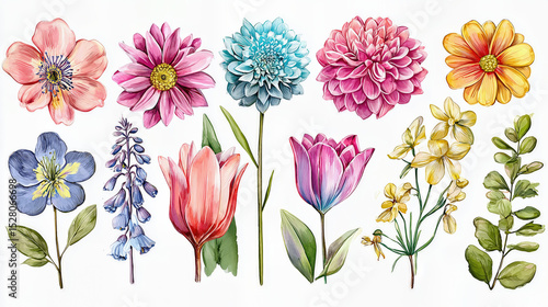 Colorful hand-drawn floral collection featuring various unique flowers and their foliage