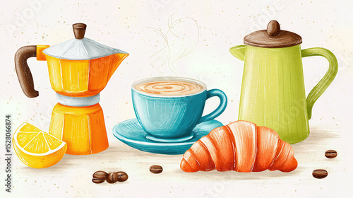 A colorful and charming breakfast scene with cappuccino and croissant