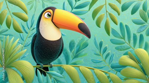 Watercolor illustration of a toucan bird on a branch with green leaves