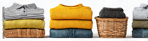 Neatly folded clothing stacks in yellow and gray tones alongside a wicker basket