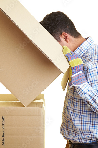 Lachender Mann trägt schwere Kartons