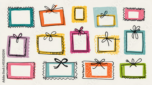 Hand-drawn colorful frames with ribbons and whimsical details on white background