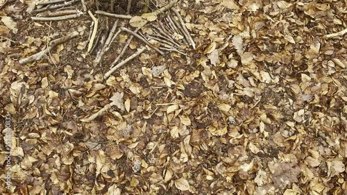 Star made of twigs on a forest floor still covered in autumn leaves.