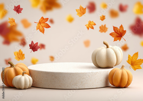Autumn pumpkin display on podium with falling leaves and orange backgrounds