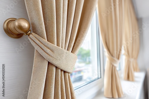 Close-up of ceiling and linen curtain with natural light filtering through wooden beams