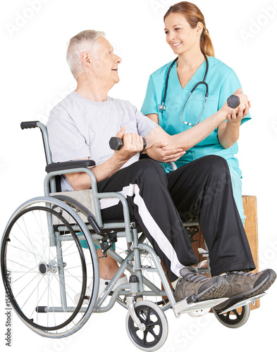 Elderly Woman in Wheelchair Doing Rehabilitation with Caregiver Assistance