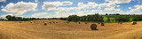 Panoramic view of harvested field with hay bales under a bright blue sky