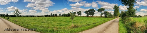 Panoramic view of a green field with a blue sky and fluffy clouds