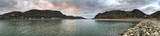 Wide panoramic view of an expansive shoreline with waves and cloudy skies
