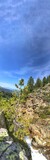 Panoramic view of a mountain landscape with trees and a flowing stream