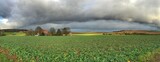Wide panoramic view of a rural landscape with dramatic stormy clouds overhead