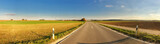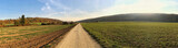 Panoramic view of a rural dirt road through open fields on a sunny day