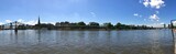 Panoramic view of bridge and cityscape over calm water in bright daylight