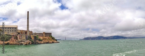 Panoramic view of historic buildings with Golden Gate Bridge in the distance