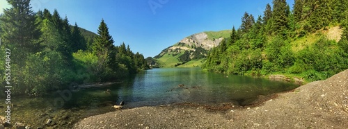 Panorama of serene alpine lake surrounded by lush forests and mountain scenery