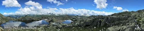 Panoramic view of alpine landscapes with reflective lakes and rugged terrain