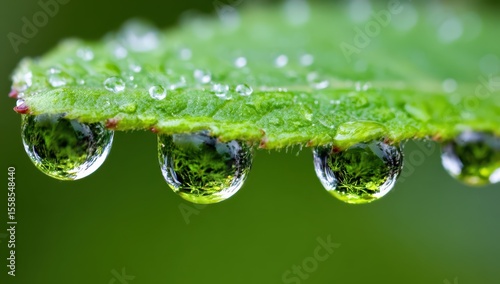 Close-up of water droplets reflecting greenery on the edge of a fresh leaf