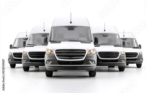 Fleet of white cargo trucks parked at a warehouse in sunset