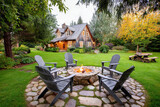 Cozy backyard with fire pit and wooden chairs during twilight ambiance