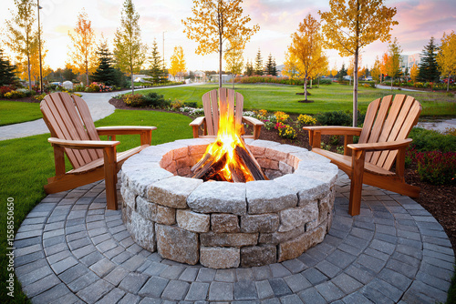 Stone fire pit with Adirondack chairs in scenic park setting at sunset