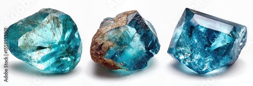 Three raw blue topaz crystals with unique textures and vivid colors on white