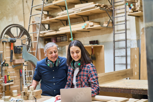 Experienced craftsman teaching young apprentice in a busy lumberyard workshop