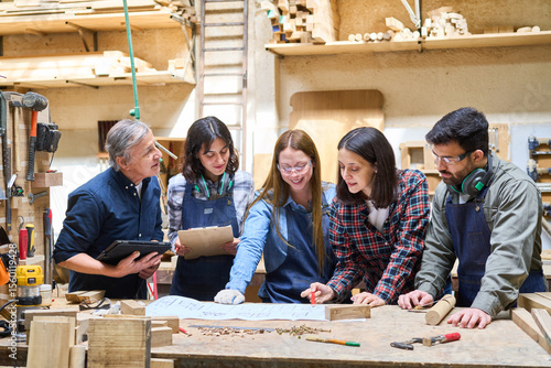 Young apprentices and mentor discussing woodworking project in lumberyard