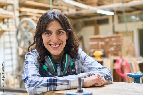 Smiling young woman in a lumberyard workshop