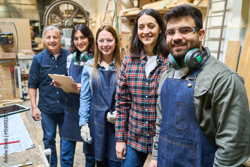 Teamwork in a lumberyard with apprentices and skilled mentor