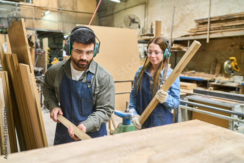 Young apprentices and mentor discussing woodworking project in lumberyard