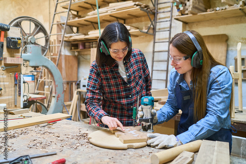 Young apprentice learning carpentry skills from experienced mentor in workshop