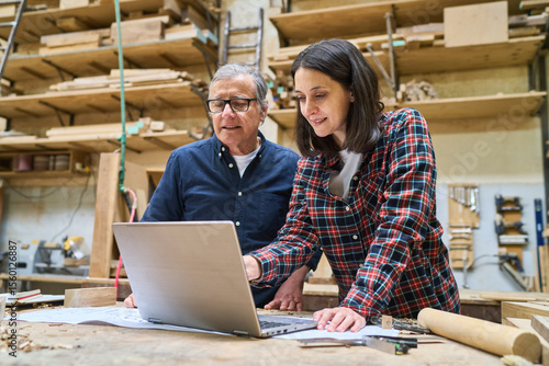 Senior craftsman using laptop in lumber workshop setting