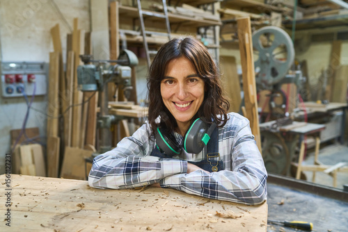 Zufriedene Handwerker Frau als Schreiner Lehrling