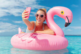 Woman taking a selfie on an inflatable flamingo in a sunny ocean