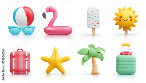 Summer vacation concept with suitcase, straw hat, and inflatable flamingo