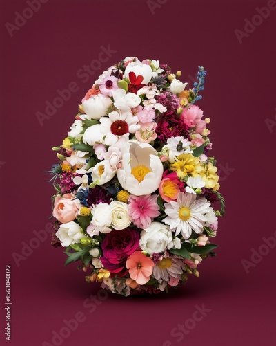 Floral arrangement shaped like an egg with vibrant springtime blooms