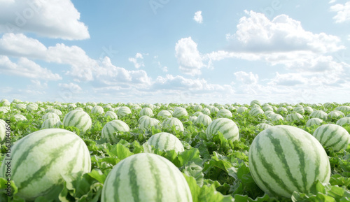 Vast watermelon field under a blue sky with fluffy white clouds
