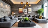 Modern living room with gray furniture and artistic decor elements