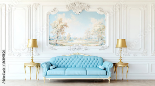 Elegant living room with a blue sofa and artistic wall decorations