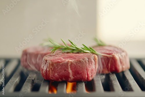 Close-up of raw steaks garnished with rosemary on a flaming grill