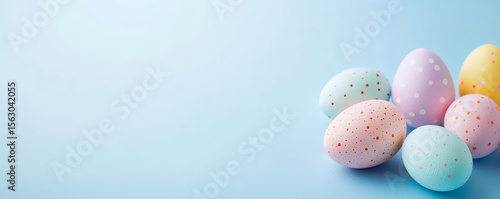 Colorful Easter eggs arranged on a blue pastel background with copy space