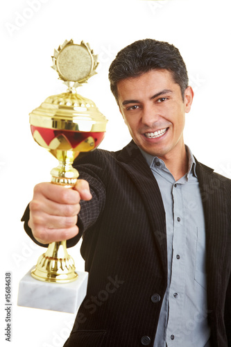 Manager hält Pokal in der Hand