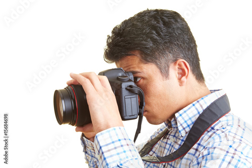 Mann schaut durch eine digitale Spiegelreflexkamera