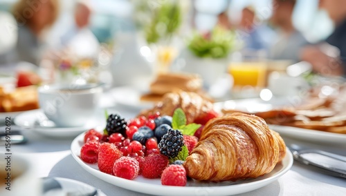 Close-up of a colorful breakfast table with croissants and fresh berries