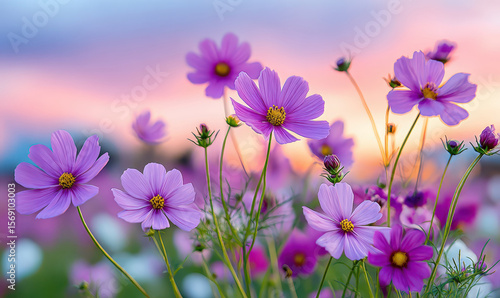 Purple cosmos flowers glowing in a colorful sunset scenery