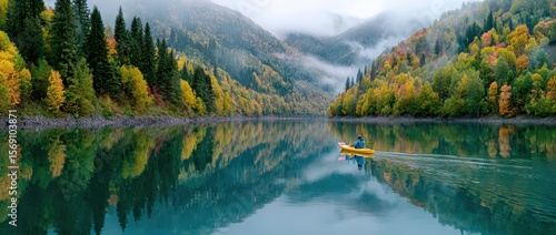 An autumn kayaker glides across a tranquil lake amidst colorful forest reflections