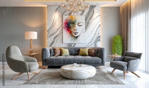 A beautiful living room interior featuring a gallery wall with framed art and cozy decor