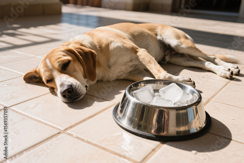 Tired dog resting beside stainless steel bowl with ice cubes on tile floor, dramatic natural light, hot weather relief, cinematic pet wellness moment, high-resolution realism #1569357051