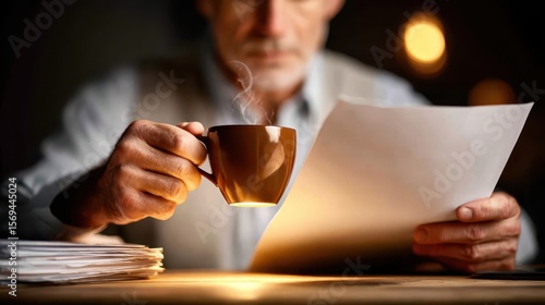 Man enjoying coffee while carefully reviewing paperwork under warm lighting