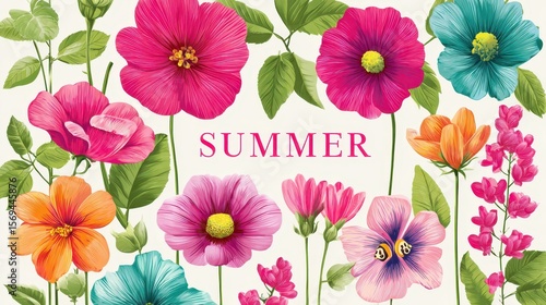 Colorful floral arrangement symbolizing summer with vibrant blossoms and green leaves